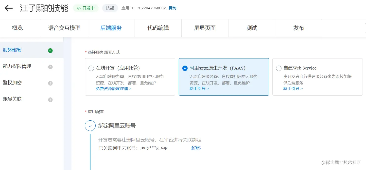 因而我选择了阿里云的 Serverless 产品 FAAS,可以直接在浏览器里进行技能后端服务的开发,调试,部署和运行。