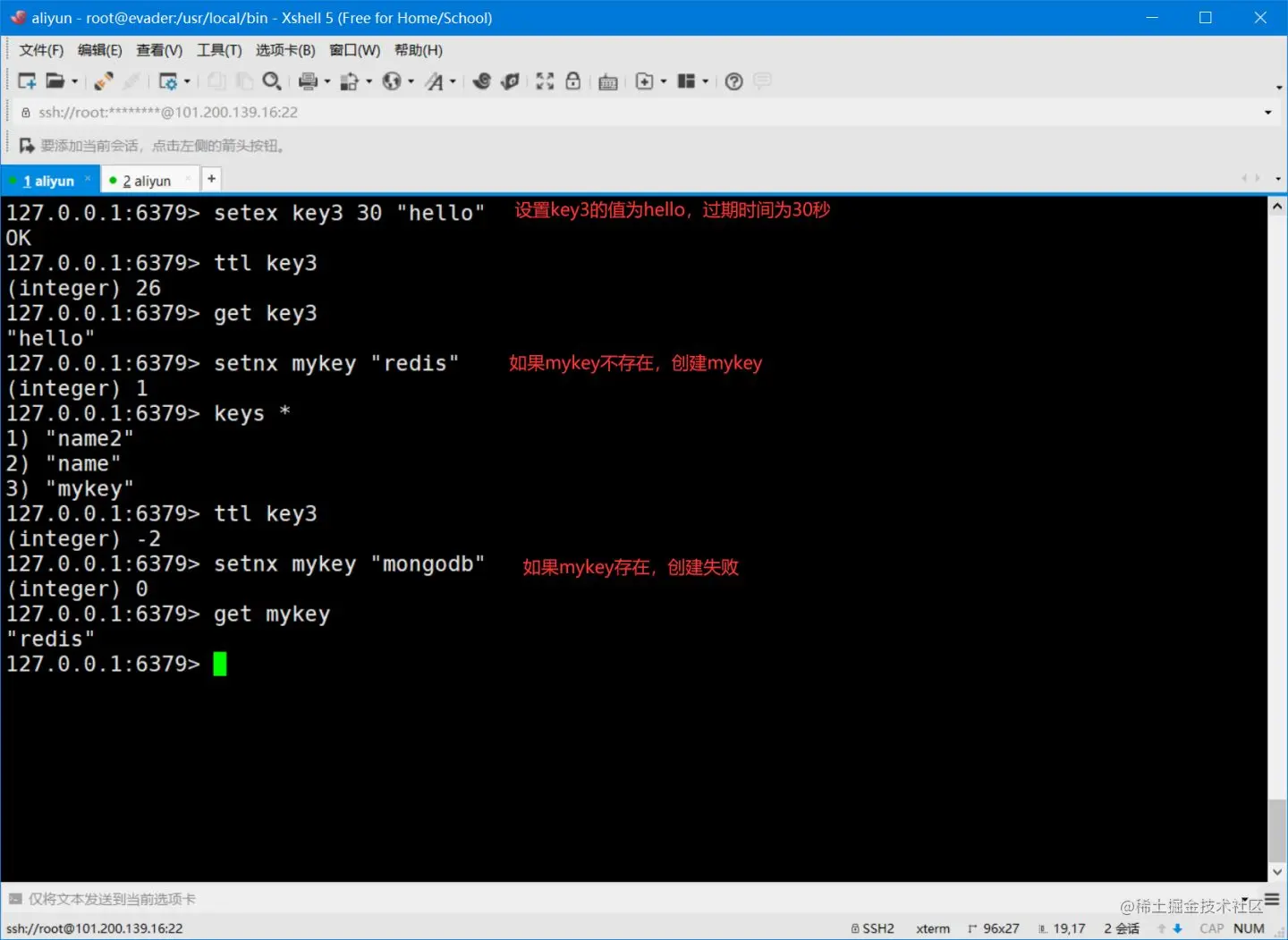 setex(set with expire) 设置过期时间 setnx(set if not exist) 不存在再设置(在分布式锁中会经常使用!)
