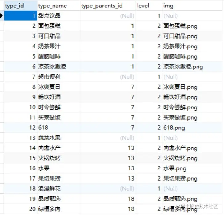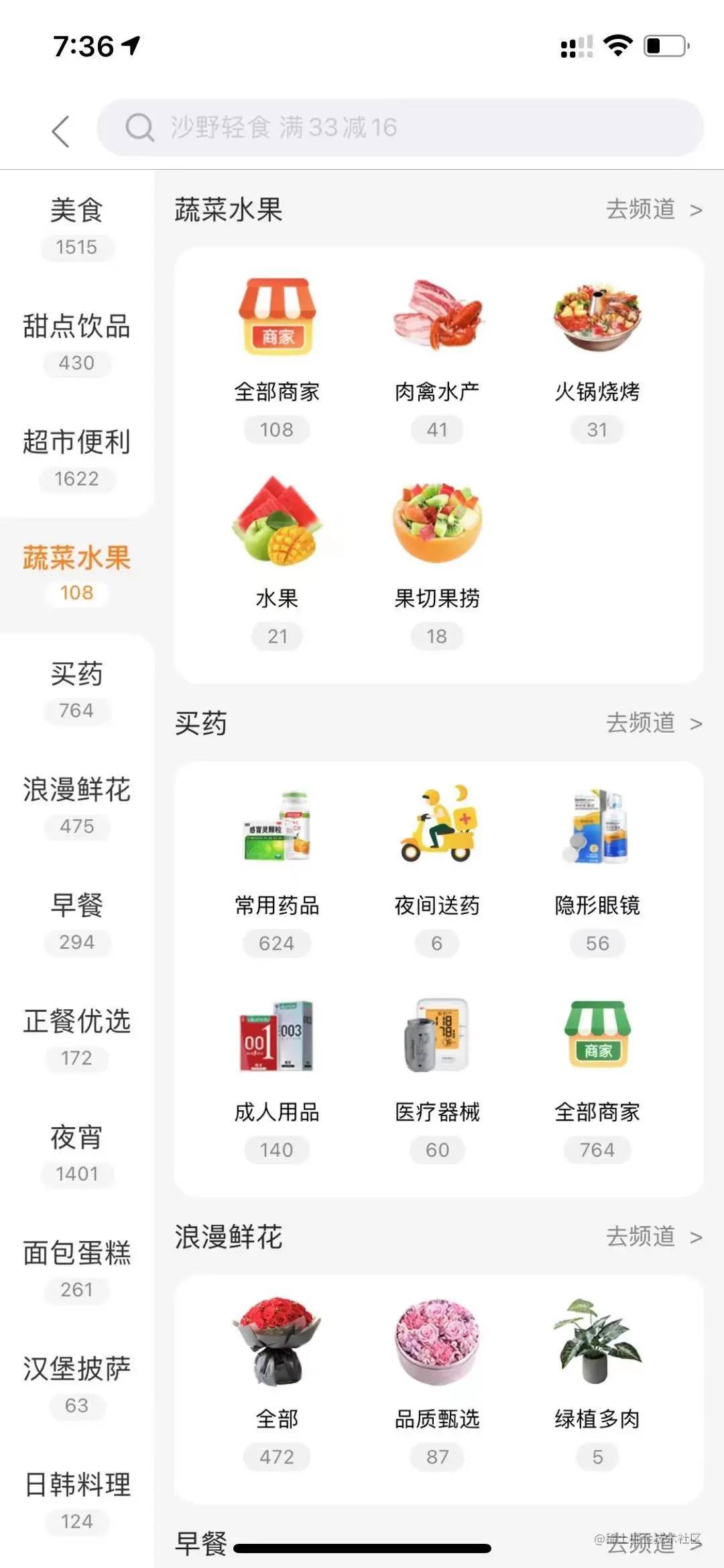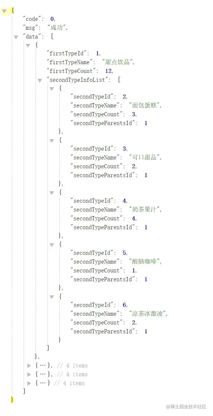 需求是返回该页面数据供前端展示,可以看到左侧一列是美团的一级分类,点击对应的一级分类右侧会展示对应的二级分类。但是图中除了分类名称还多了数量,这个会是这个案例最难解决的点。如果解决好了是一层循环,如果解决不好就是两层循环。
