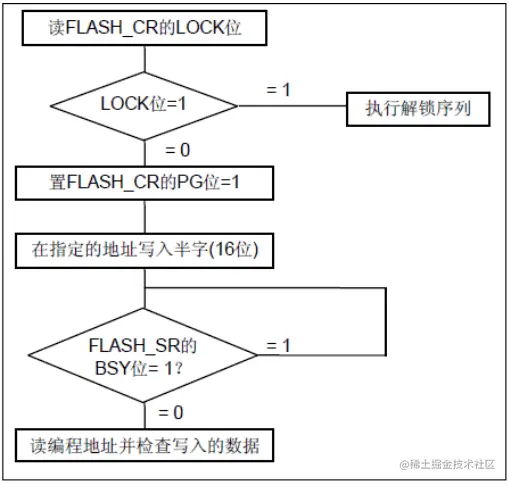 STM32的Flash写入顺序如下: - 检查 FLASH_CR 的 LOCK 是否解锁,如果没有则先解锁