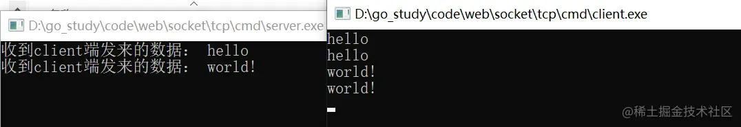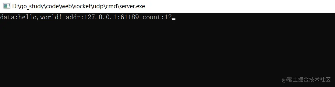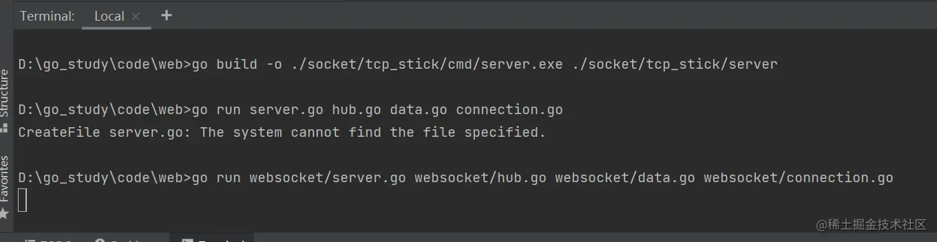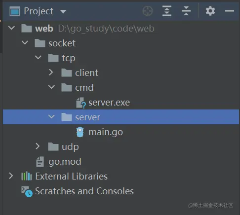在终端执行:go build -o ./socket/tcp/cmd/server.exe ./socket/tcp/server,编译出可执行文件server.exe并保存在cmd包下。