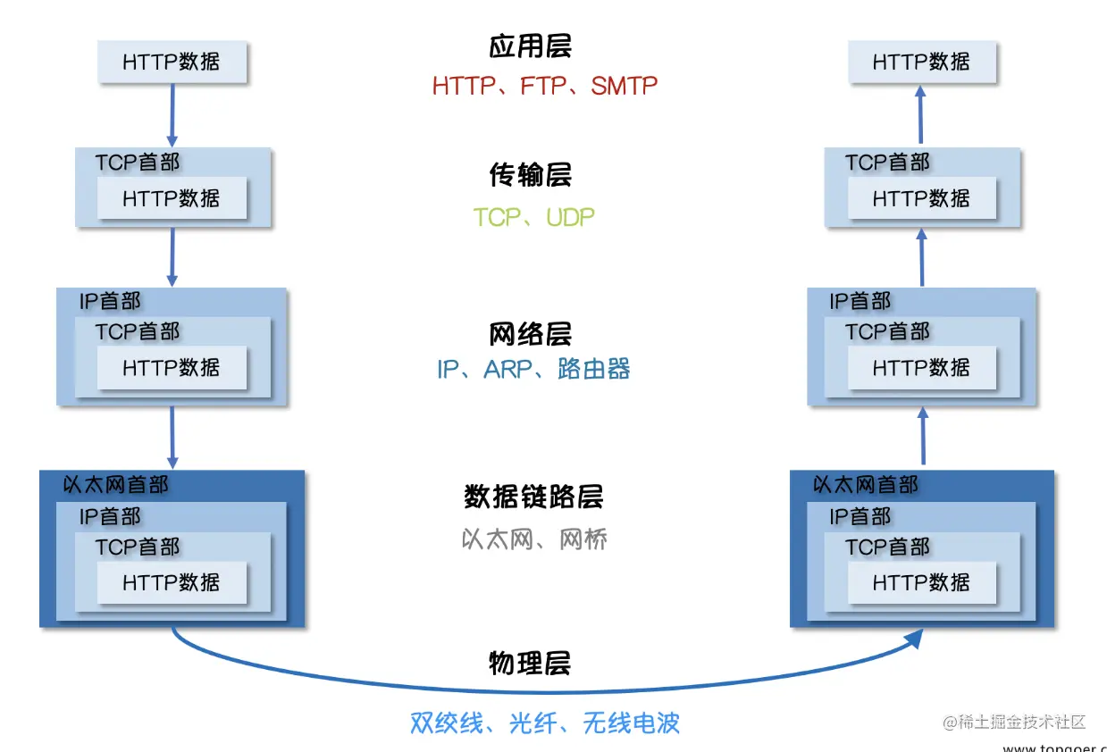 发送方的HTTP数据经过互联网的传输过程中会依次添加各层协议的标头信息,接收方收到数据包之后再依次根据协议解包得到数据。