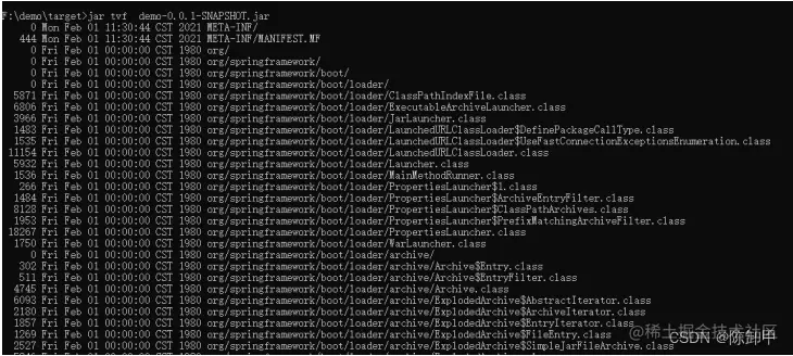 如果查看target目录,则应该看到demo-0.0.1-SNAPSHOT.jar。该文件的 大小应为16.2 MB左右。如果您想窥视内部,可以使用jar tvf,如下所示