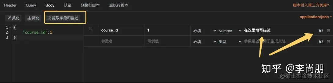 对于raw类型的body参数,我们可以通过点击“提取字段和描述”来针对参数进行描述的填写: