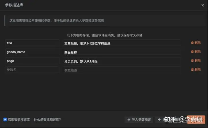 填写参数描述是我们最烦恼的一件事情,尤其对于很多接口来说,往往具有大量相同名称、相同意义的参数,假如每次都需要手动录入,将会是一件非常耗时、低效的事情。