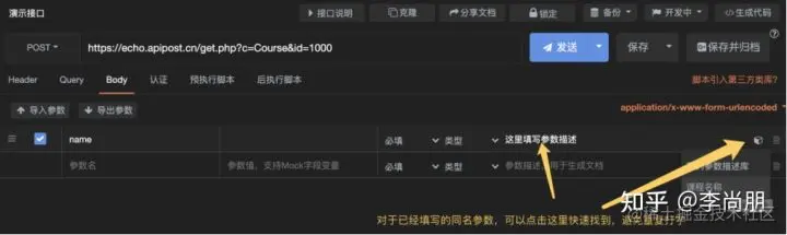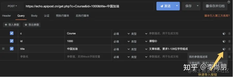 如图中所示,对于一个填写过的参数,我们可以在新建接口可以通过点击参数描述后面的♦️方块标志快速导入描述,不用重复打字。