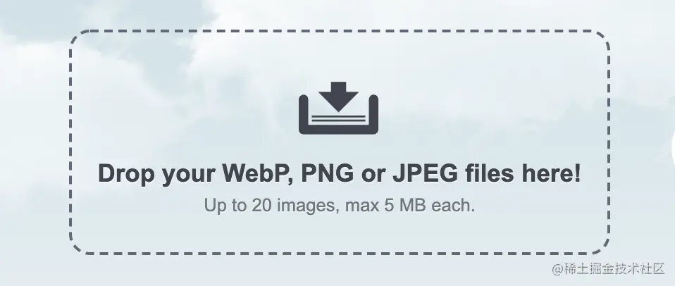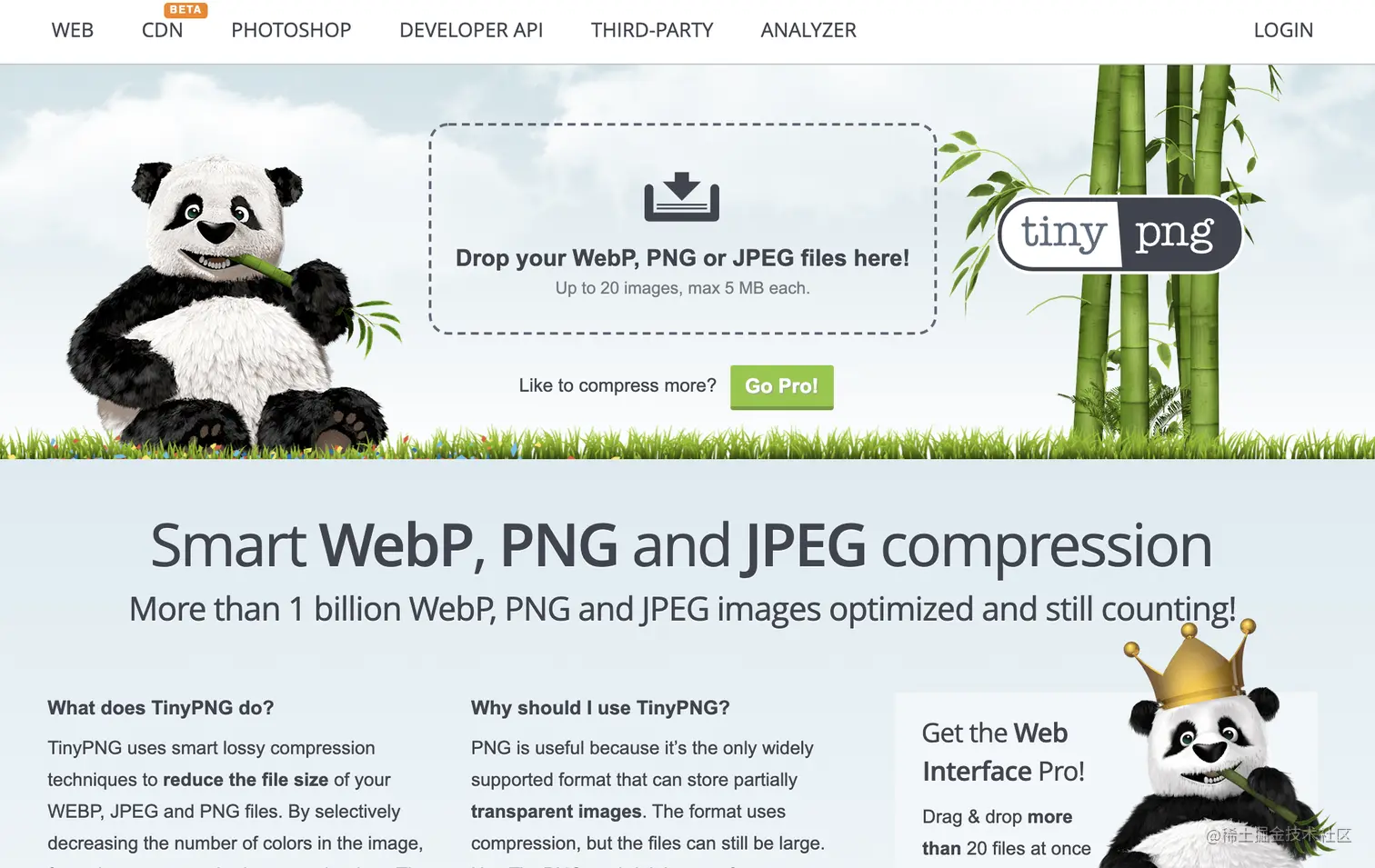 可以看到,网站的一个大标题就是 "Smart WebP, PNG and JPEG compression",意思就是智能的 WebP、PNG 和 JPEG 格式的压缩工具。