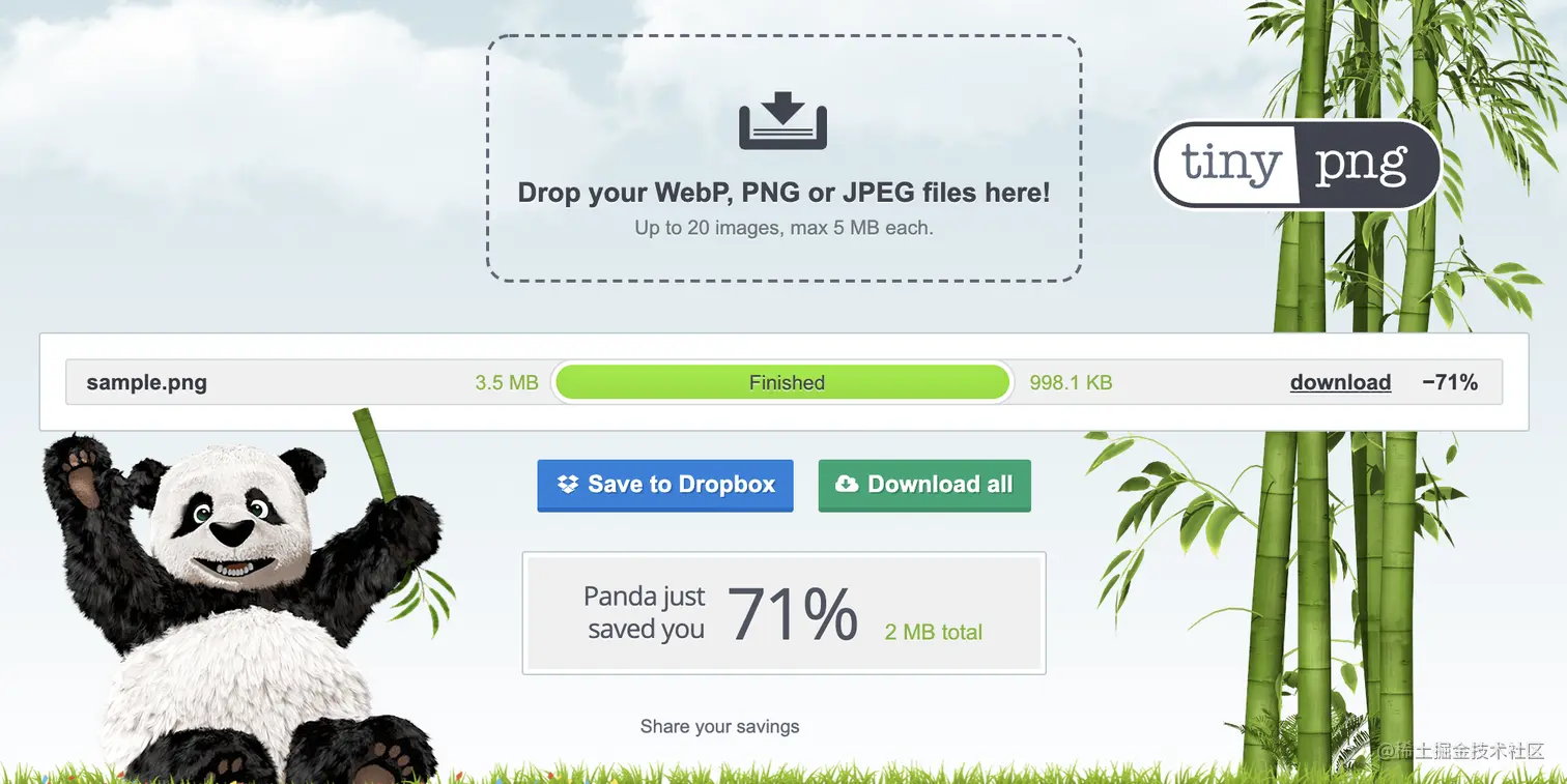 看简介可以了解到,TinyPNG 这个网站使用了有损压缩技术来减小 WebP、PNG、JPEG 格式图片的文件大小,它通过有选择地减少图像中的颜色数量来达到压缩效果,同时由于咱们人眼对这种细微颜色变化感知比较弱,所以压缩前后图片在人眼看到几乎是没什么区别的。