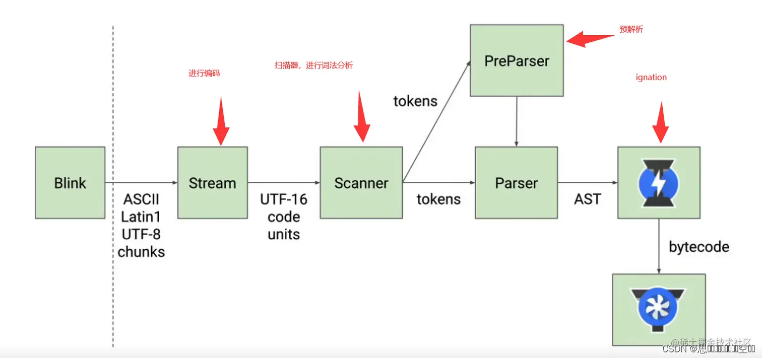 1、Blink会将下载好的源码交给V8引擎,Stream获取到源码并进行编码转换