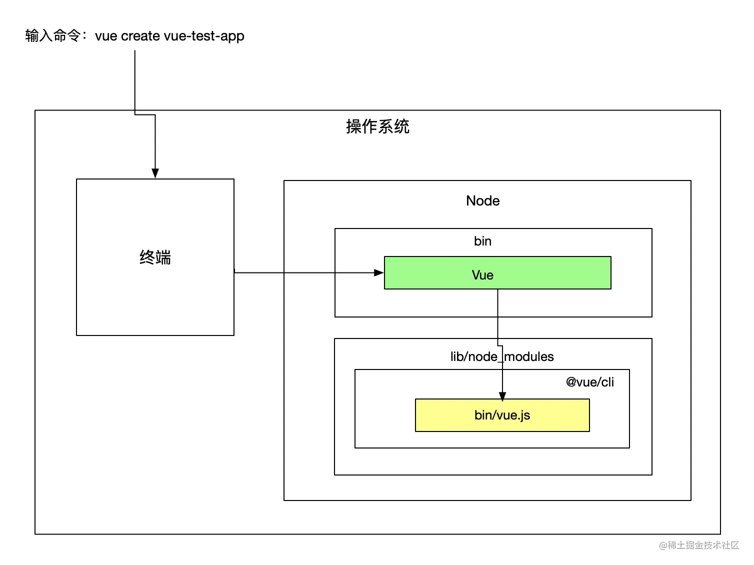 2.终端会在 $PATH 查询 vue 命令。相当于执行 which vue