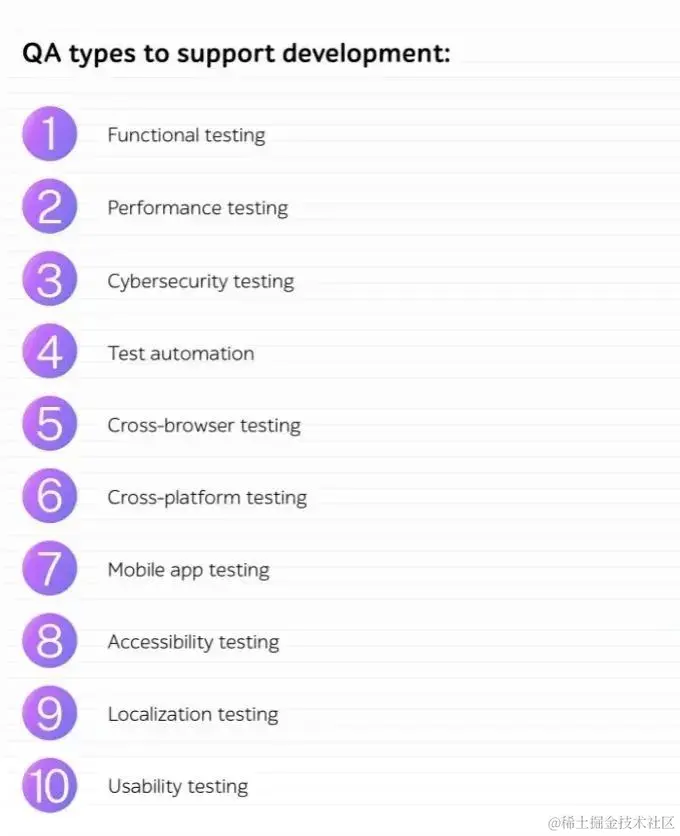 当开发人员专注于执行单元和集成测试时,QA 团队会创建测试工具以确保高的软件质量并为发布准备功能。为了取得成功,这里有 10 种测试类型,根据产品细节和业务需求,这些类型可能会派上用场: