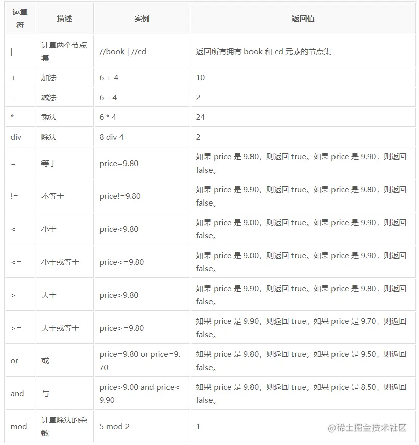 | /bookstore/book[price>35.00] | 选取 bookstore 元素的所有 book 元素,且其中的 price 元素的值须大于 35.00。 |