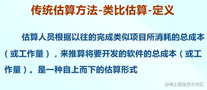 同理,采用类比估算方法,估算软件项目时,可以找一个相似的项目,根据相似项目总的工作量,成本来估算本项目的总规模成本,然后估算各个工作单元的规模成本,所以是一种自上而下的估算形式。
