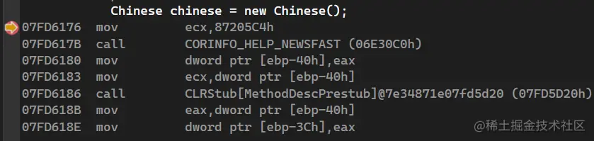 这里的 eax 是 CORINFO_HELP_NEWSFAST 初始化方法的返回值,可以在 ecx,dword ptr [ebp-40h] 处下一个断点,观察它的内存布局。
