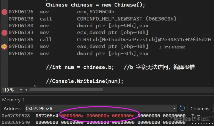 根据 C# 的类继承原则,上面的 chinese.b 写法肯定是无法被编译的,因为它属于父类的 私有字段,既然无法被访问,那这个 private b 到底去了哪里呢? 要想找到答案,只能先从 chinese 实例处的汇编代码看起,看看有没有什么意外收获。