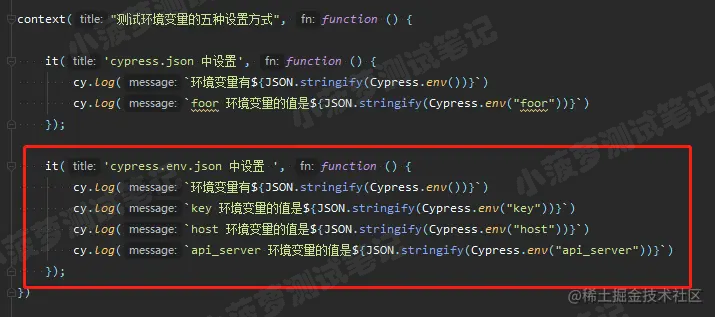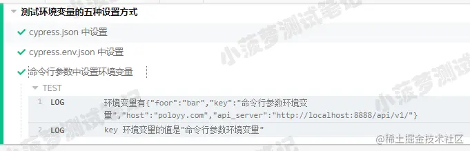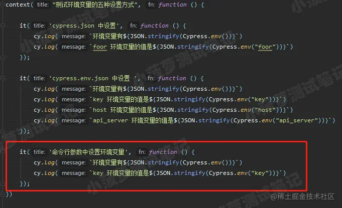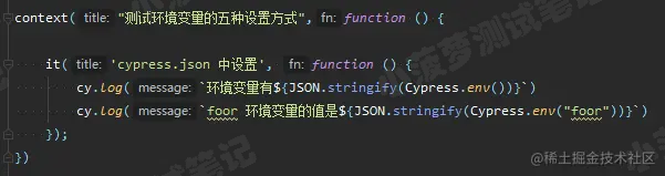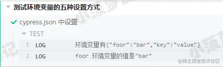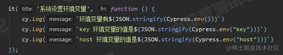- 在测试运行时,可以使用 Cypress.env() 访问环境变量的值
