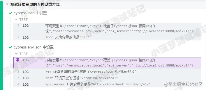 - 会直接覆盖 cypress.json 和 cypress.env.json 文件中重名的环境变量