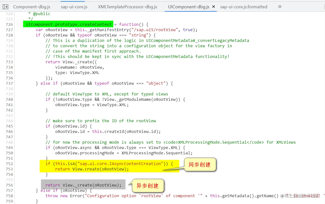 所谓 Component 的异步创建,即是 SAP UI5 框架的 createContent 函数,返回一个 Promise. 这个 Promise 也将被链接到 Component.create 工厂方法的结果 Promise 中。