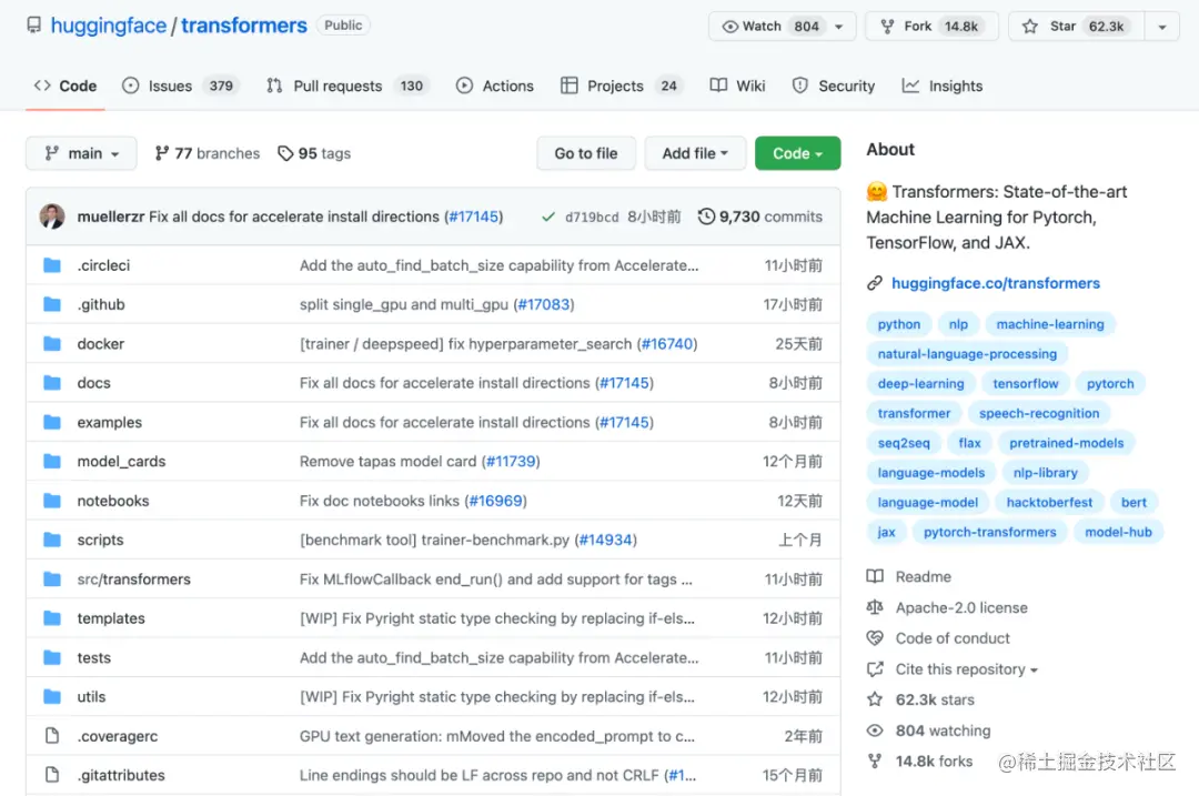 目前,Hugging Face 在 GitHub 平台上的 Transformer 开源库已经有 62000 个 Star 和 14000 个分支。