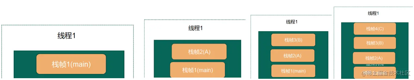 我们把代码跑起来,线程1来运行这段代码, 线程1跑起来,就会有一个对应的虚拟机栈,同时在执行每个方法的时候都会打包成一个栈帧。
