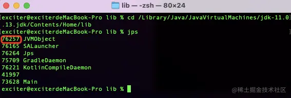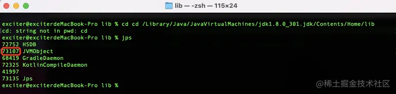 2、在JDK的lib目录下使用jps查看进程,可以看到JVMObject的进程号是73107