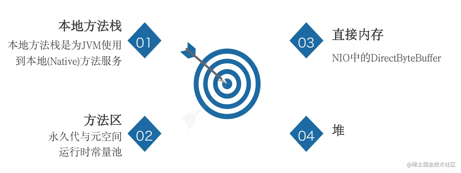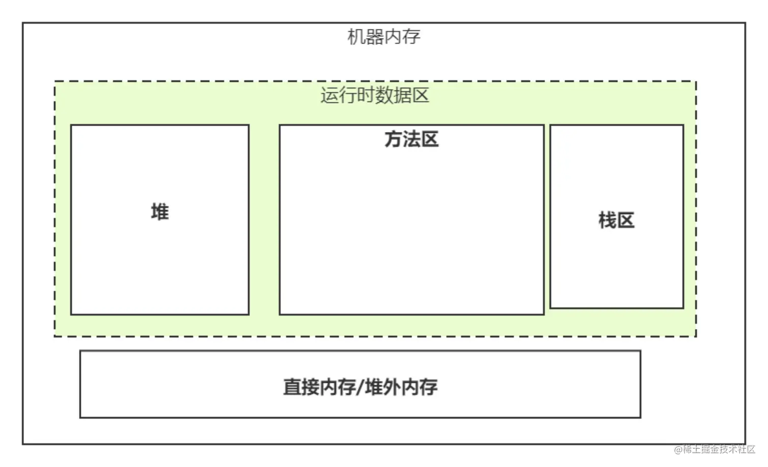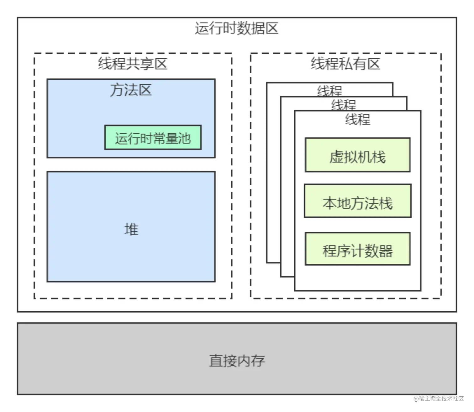 直接内存: 这个虽然不是运行时数据区的一部分,但是会被频繁使用。你可以理解成没有被虚拟机化的操作系统上的其他内存(比如操作系统上有8G内存,被JVM虚拟化了3G,那么还剩余5G, JVM是借助一些工具使用这5G内存的,这个内存部分称之为直接内存)。