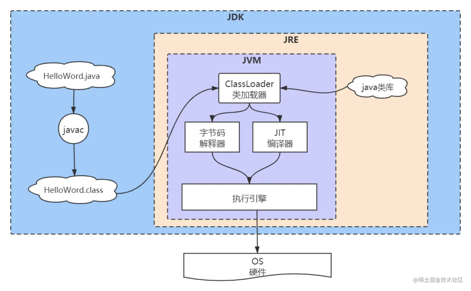 一个Java程序,首先经过javac编译成.class文件,然后JVM将其加载到方法区,执行引擎将会执行这些字节码。执行时,会翻译成操作系统相关的函数。JVM作为.class文件的翻译存在,输入字节码,调用操作系统函数。