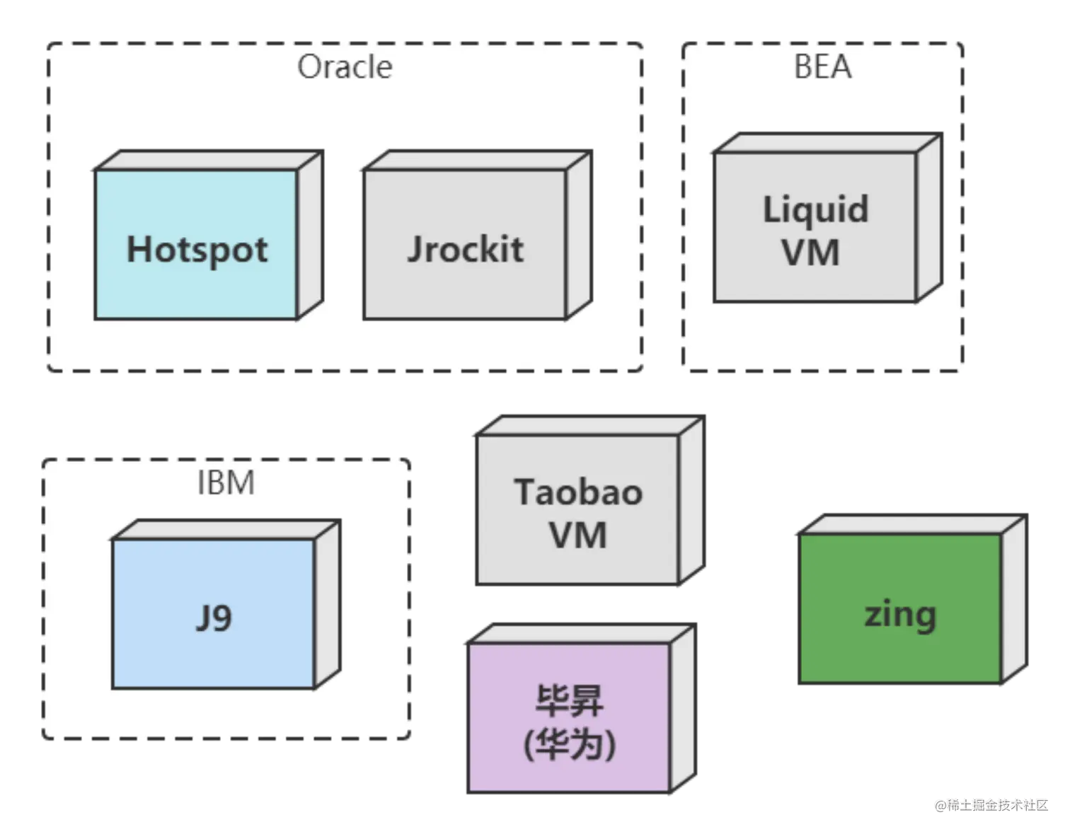 TaobaoVM: 只有一定体量、一定规模的厂商才会开发自己的虚拟机,比如淘宝有自己的VM,它实际上是Hotspot的定制版,专门为淘宝准备的,阿里、天猫都是用的这款虚拟机。