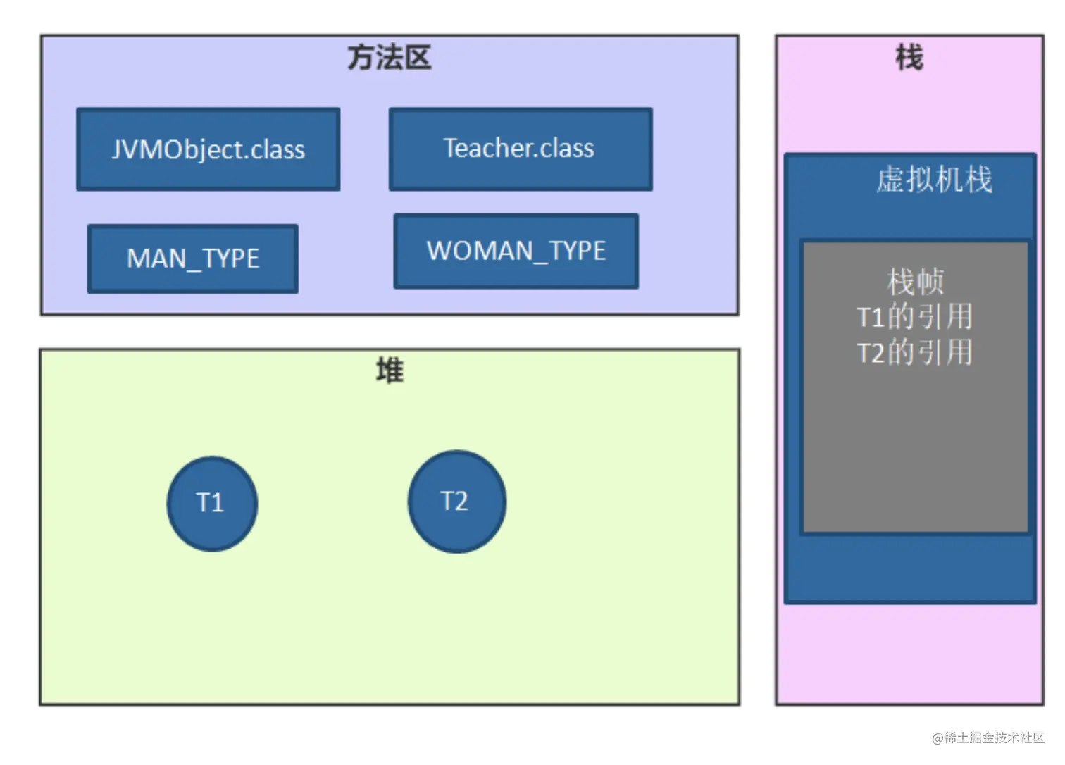 后续代码中遇到new关键字,会再创建一个Teacher对象,对象引用T2就存放在栈中。