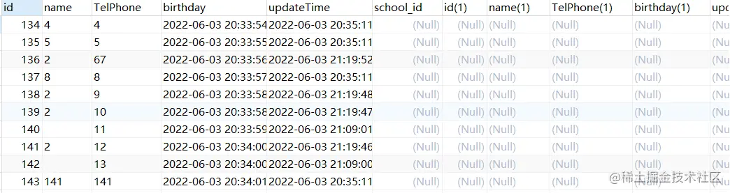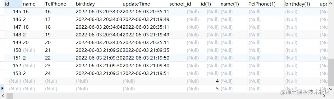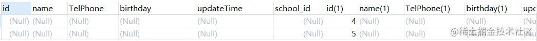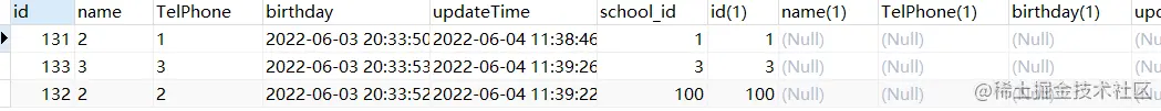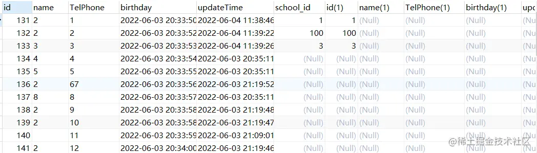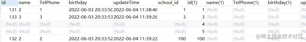 可以看到查询的结果中包含两个表的数据,有没有学校信息的学生都被查询了出来