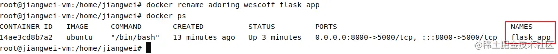 容器成功启动后,我们就可以通过exec命令进入容器内部,然后部署我们的应用了,不过在这之前我们可以通过rename去给容器重新修改一个名字,因为我们在执行run命令的时候,没有通过name参数给容器指定一个名称,因此docker会自动给我们的容器创建一个随机的名称,如下图所示,将容器重新命名为flask_app,然后通过ps命令去查看,容器显示命名称为flask_app,则说明容器名称修改成功。