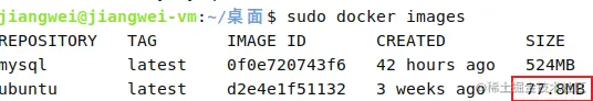 在docker中有两个概念:镜像、容器。镜像顾名思义,就是我们平时所说的操作系统比如ubuntu、centos等,但是在docker中的镜像一般都是经过精简后只提供最小的运行单元,比如你通过docker pull ubuntu 会自动将最新的ubuntu镜像从docker的服务器拉去到本地,通过docker images 可以看到如下图所示的信息,镜像的大小只有77.8MB.