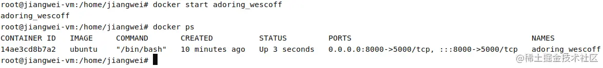 sudo docker start adoring_wescoff # 跟容器名称