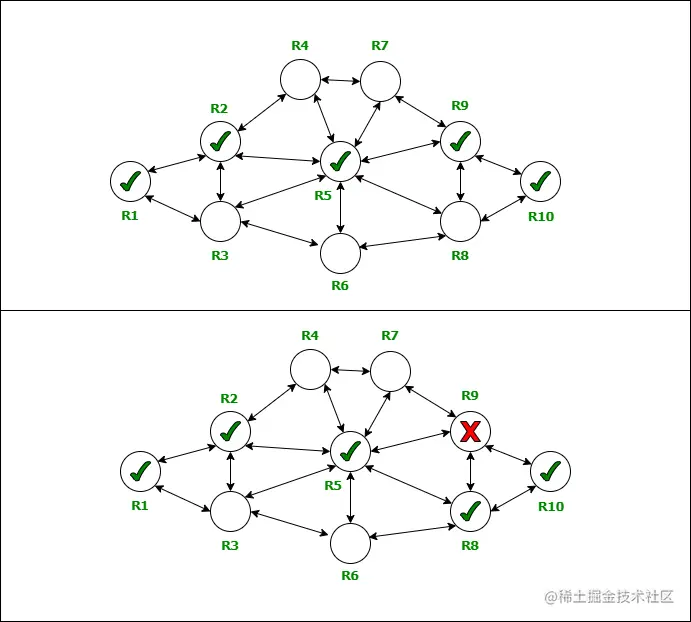 - 发消息的路由器与其他路由器共享路由消息