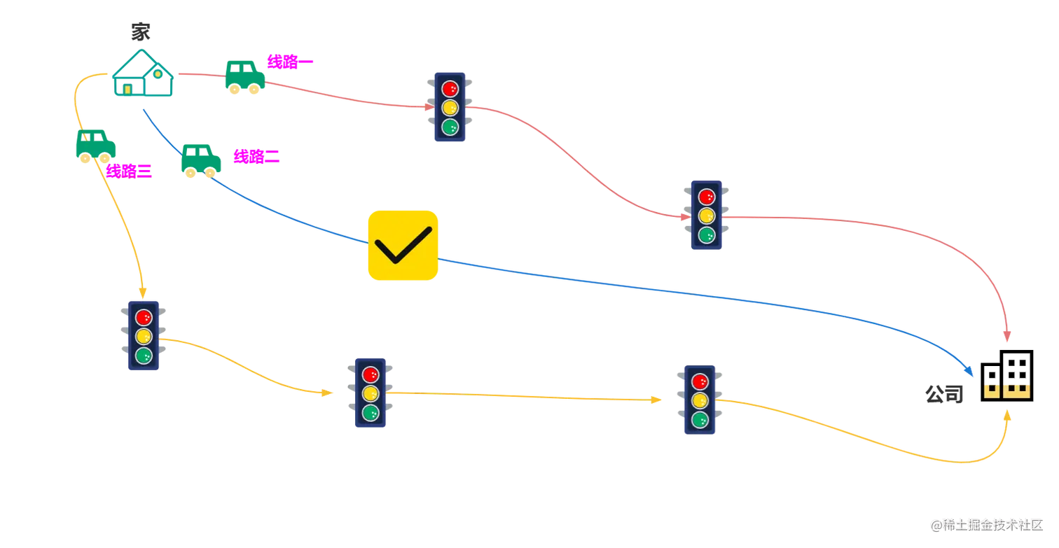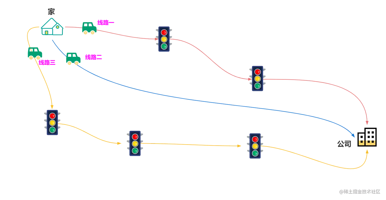 用人话来做个解释:你就把动态路由看做智能无人驾驶汽车,你从家去公司上班有三条路可以选择: