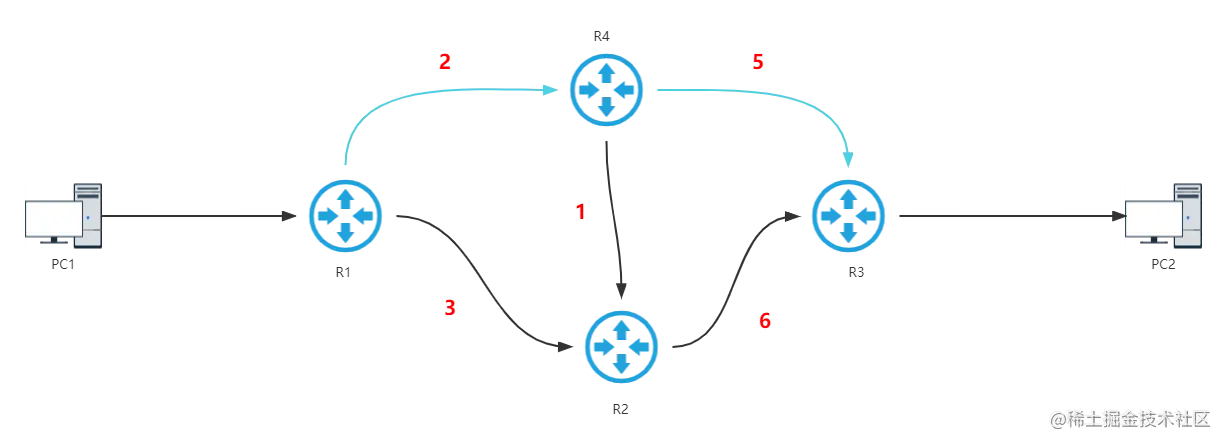最终通过Dijkstra 算法即最短路径优先算法算出来链路一最优,走PC1 -> R1 -> R4 -> R3 -> PC2。