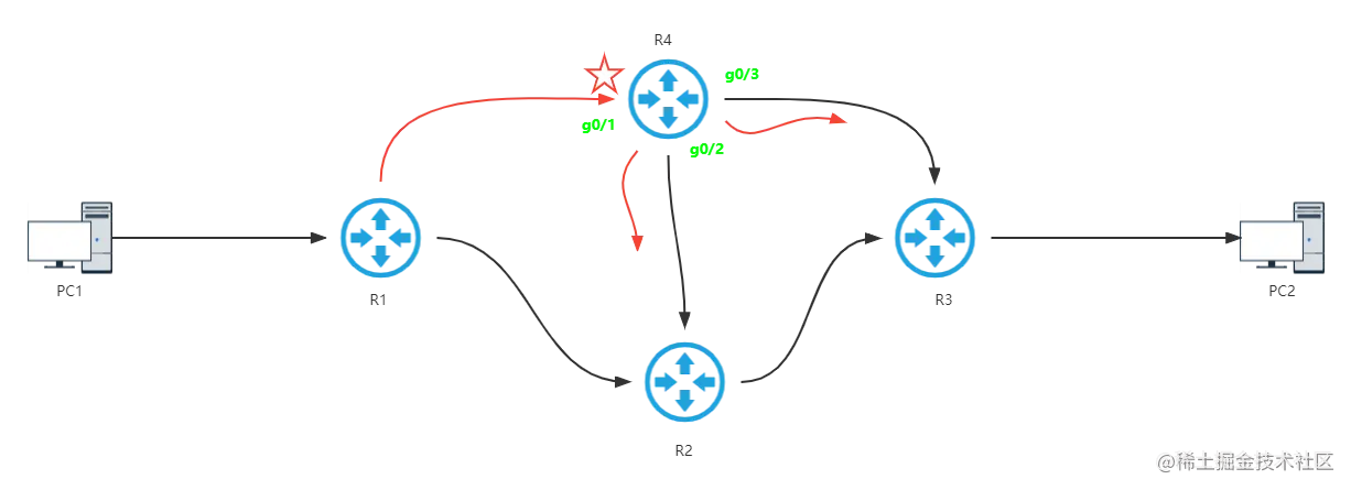 PC1 -> R1 -> R4 -> R2 -> R3 -> PC2 - 链路三:
