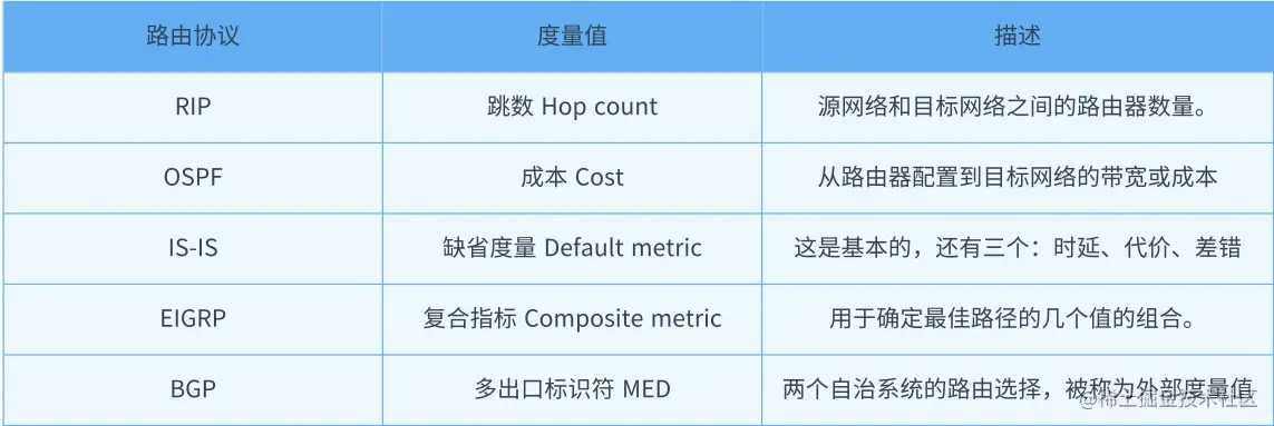 下图是各个路由协议的度量值: