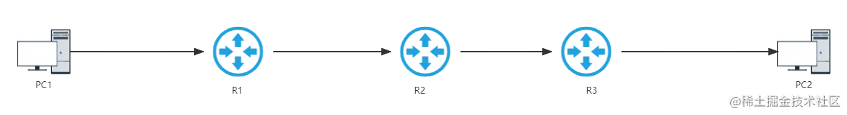 如图,这张简单的拓扑中,距离就是经过的三台路由器,方向就是数据流向方向:PC1 -> R1 -> R2 -> R3 -> PC2