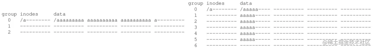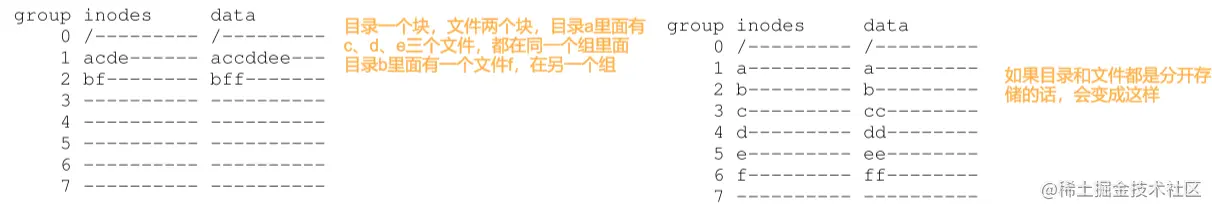这样分组的意义在于分配文件和目录空间,事实上,分配只有一个原则:把相关的东西放在一起,这里我们用一些简单的启发式方法来定义什么东西是相关的,对于目录数据,找到已分配目录比较少、空间比较大的组(方便组间平衡目录),全部放进去,对于文件数据,首先是放到对应的inode附近,其次是相同目录的文件放到同一组里面。如下图所示