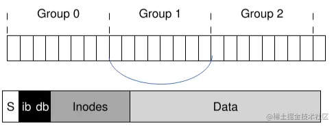 但是这种结构并不是易用的,磁盘导出一共基于块的逻辑地址空间,并从客户端隐藏其几何结构。具体的,将逻辑地址空间相对应的分组,一组上的逻辑地址空间由一组cylinder上平行的物理空间组成,每一个组内都有一个和普通文件系统一样的数据结构,如下图所示
