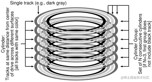 第一步就是更改磁盘上的结构,重新定义磁盘结构为一组cylinder,一个cylinder是不同盘片上平行的一条轨道。下图中,一共有3条cylinder。