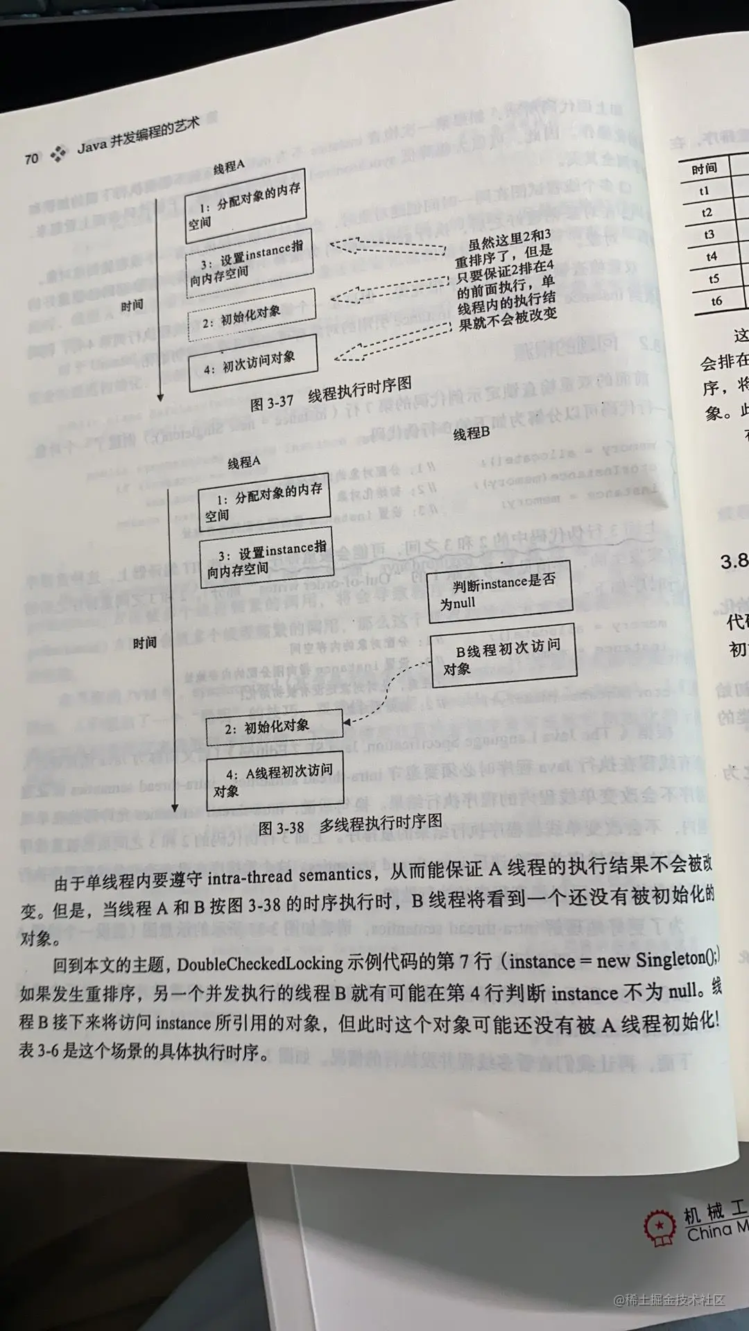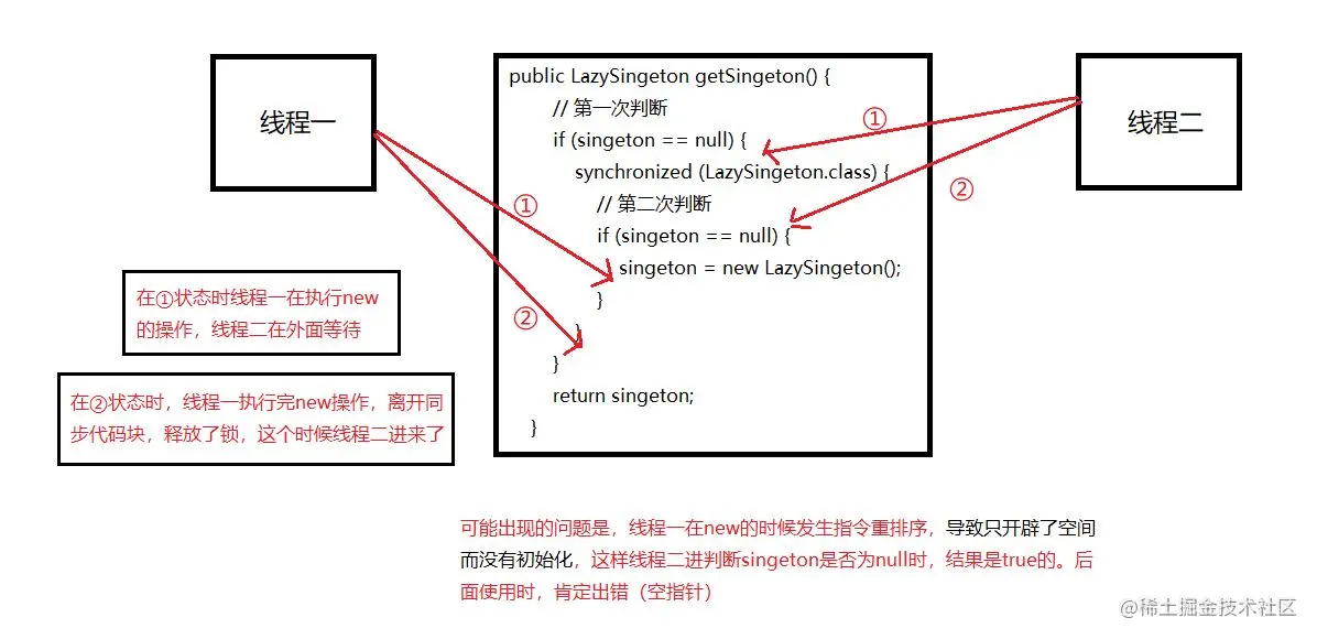 这个流程大家应该都清楚,现在假设A,B两个线程同时来获取单例,A线程进入同步代码块,执行完上述操作后,直接释放锁。这个时候其他线程就会进入同步代码块,此时如果线程A只是刚在内存中开辟了空间,而没有实例化这个空壳子,那么第二个线程走到if时,就不会走if里面的代码。从而返回的是个null。文字有点不好理解,大家结合图片来看。