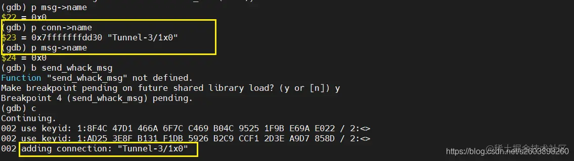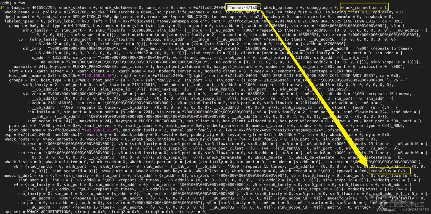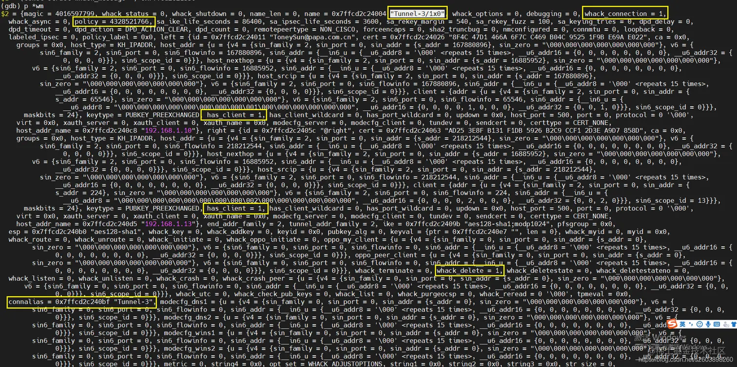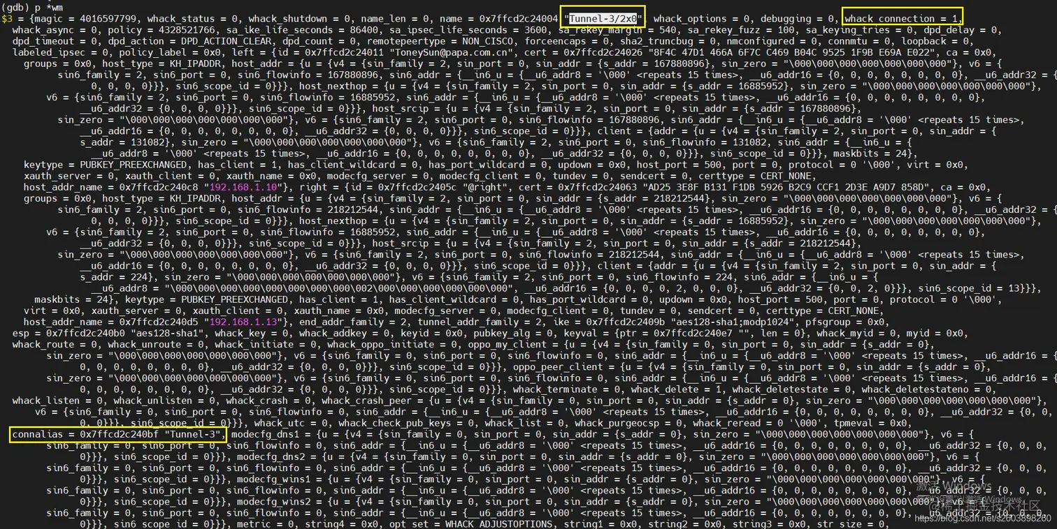 前两张图是正常的配置文件中多个保护子网是的whack msg消息:可以看出隧道名称分别有wm->name和wm->connalias两个名称,其中connalias是主隧道名称,而name则是多保护子网的子隧道名称。