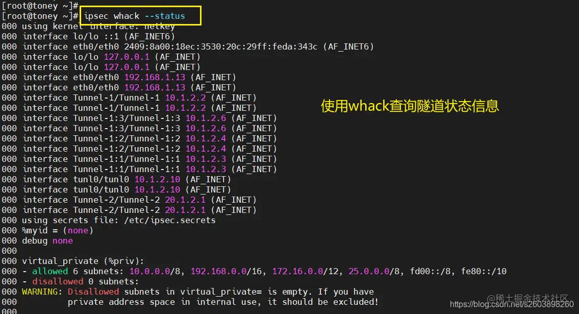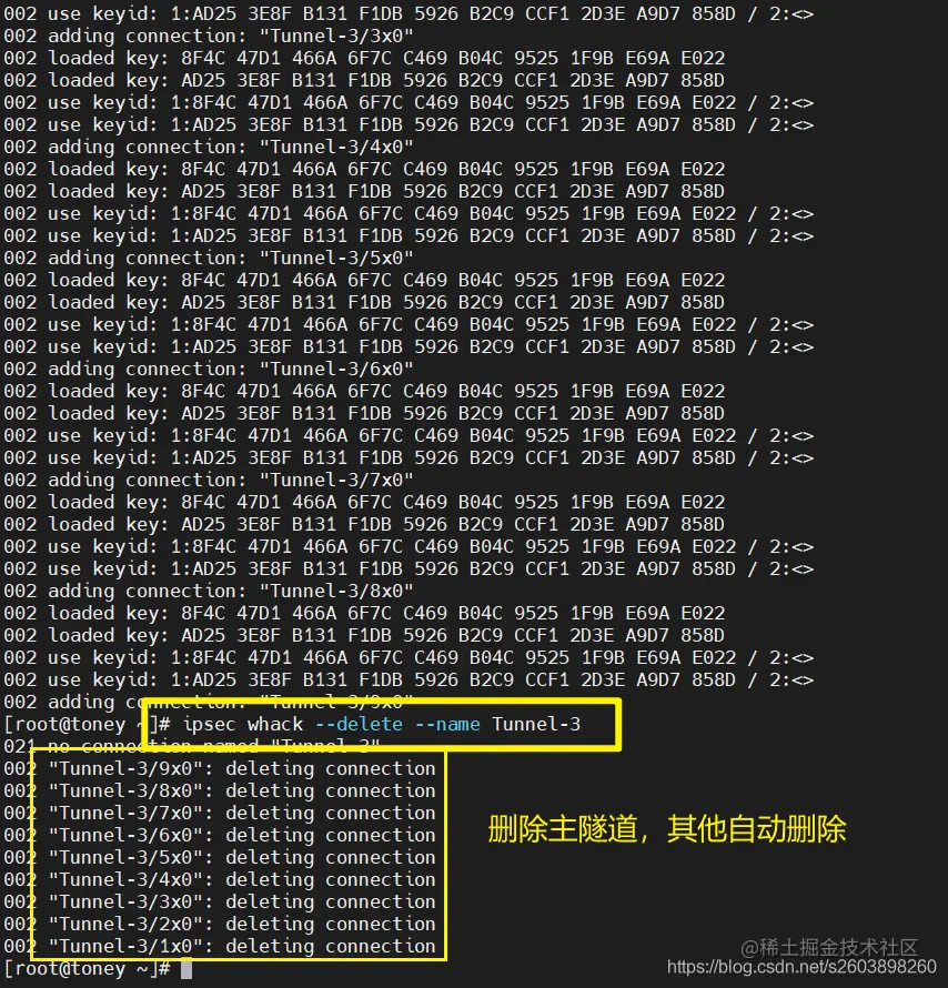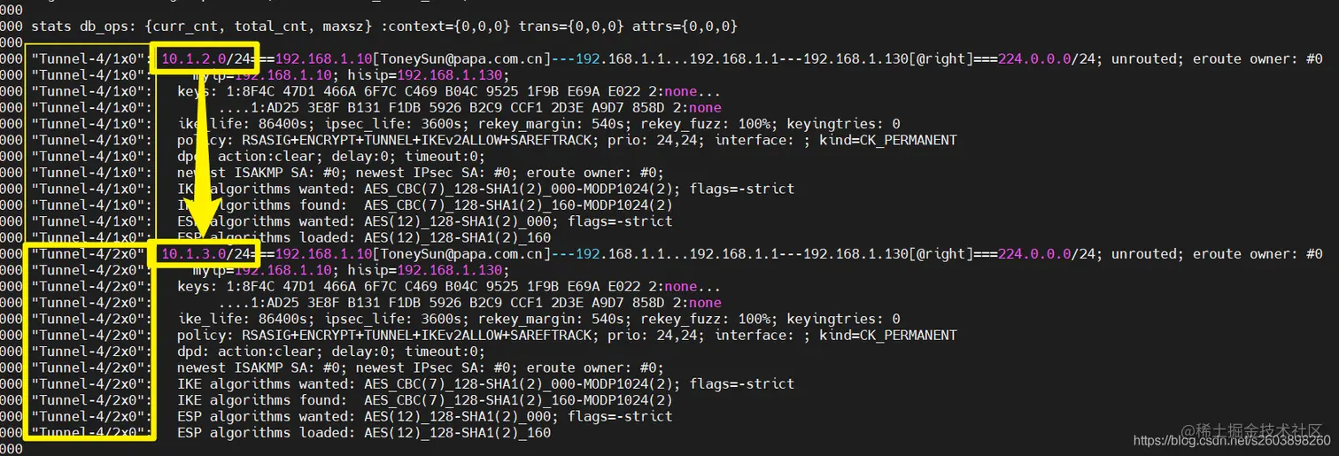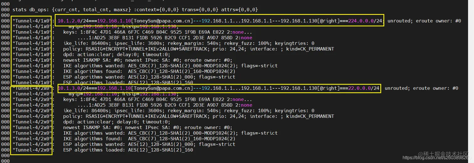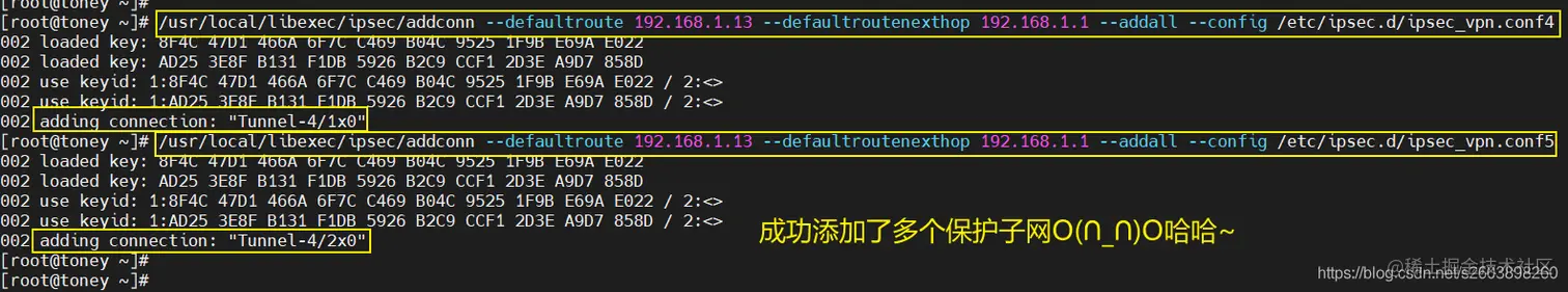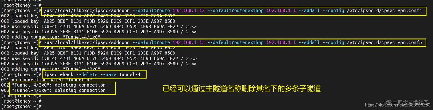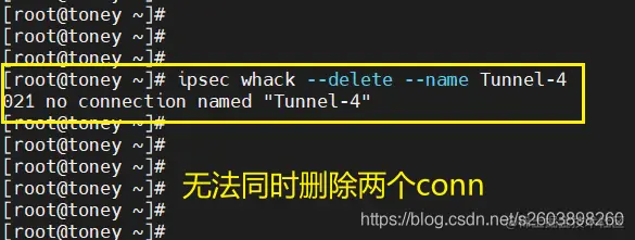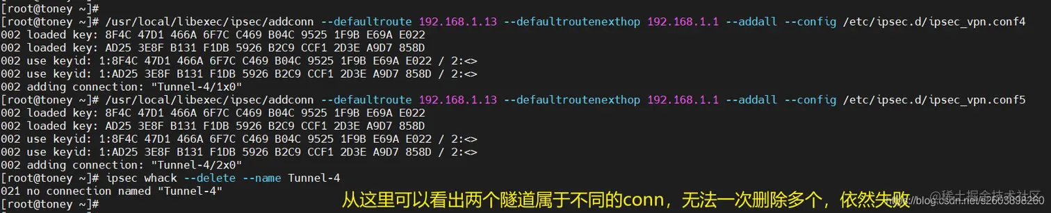 但是无法删除两个连接,因此在pluto中可能认为这是两个不同的连接。so****不是简单的通过隧道名字来实现多个保护子网的。