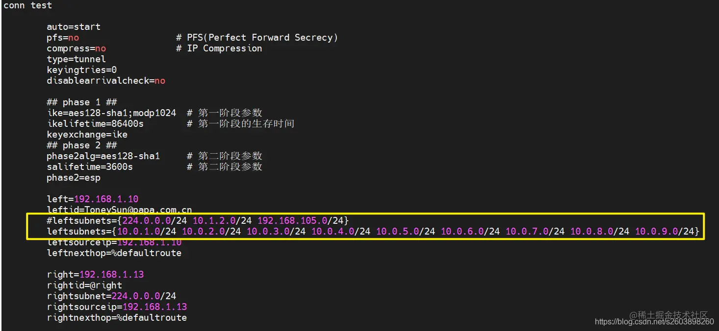 目的:梳理ipsec如何解析配置文件,支持并添加多个保护子网
