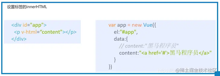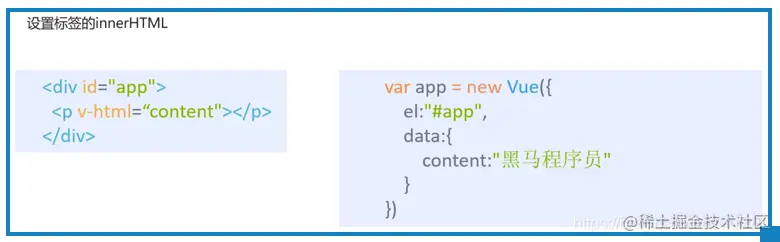 这个指令的作用是:设置标签的innerHTML。知道这个属性以后,你可能想到它跟v-text的区别了,