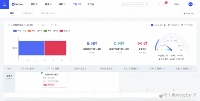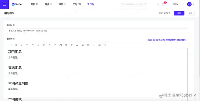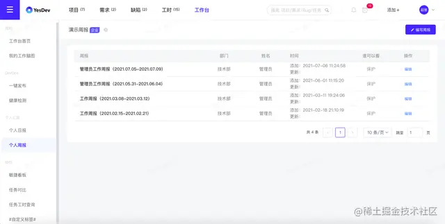 在日常工作中,除了要登记工时,还要进行工作日报、工作周报的编写,如果使用了YesDev,还可以自动汇总自己的日报和周报。