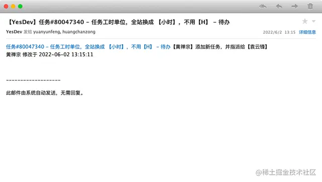 如前面所言,任务分配和Git自动任务时,YesDev会推送必要的消息通知。例如支持个人对个人的邮件通知: