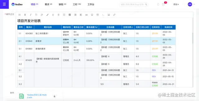 再进一步,录入任务工时后,你还可以得到自动汇总好的需求排期表: